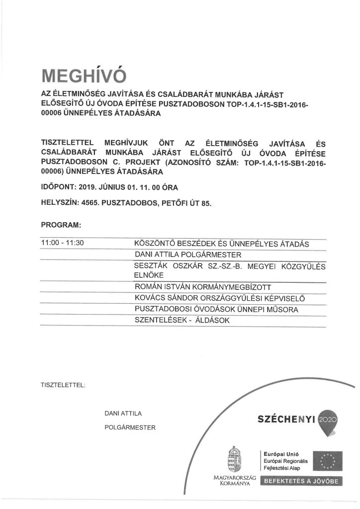 Projekt címe: | Az életminőség javítása és családbarát munkába járást elősegítő új Óvoda Építése Pusztadoboson | |